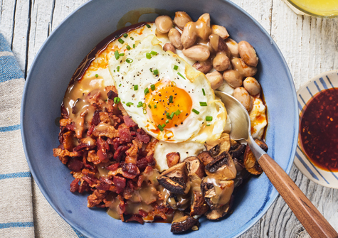 - Lightly drizzle Yum Yum sauce across eggs and noodles. Garnish with crispy bacon, freshly chopped cilantro leaves, thinly sliced scallions and lime wedges.
