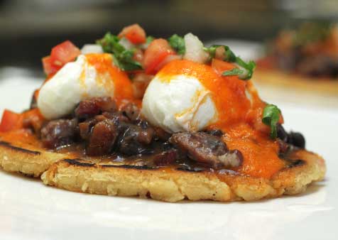 - Take a portion of corn masa and roll it into oval shape. Preheat ungreased comal on medium heat. Cook the oval masa on both sides for 4 minutes. Place it directly on a plate and spread warm black beans. Finish it off with poached eggs and Salsa de Arbol on top.