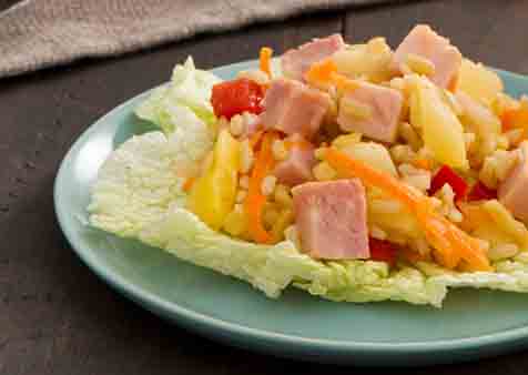 - To serve, spoon 1/3 cup ham mixture down center of each cabbage leaf. Drizzle with 1 to 2 tablespoons lemon sauce. Fold up sides of cabbage to form shape of canoe to eat. Cover and refrigerate leftover lemon sauce.