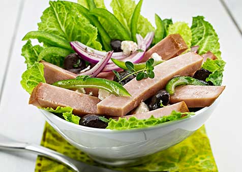 - In a large bowl, combine chopped lettuce, green peppers, red onions, olives, and ham.