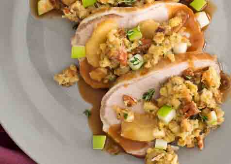 2. Arrange heated pork loin slices on dinner plate with stuffing between slices. If desired, ladle gravy over pork and stuffing.